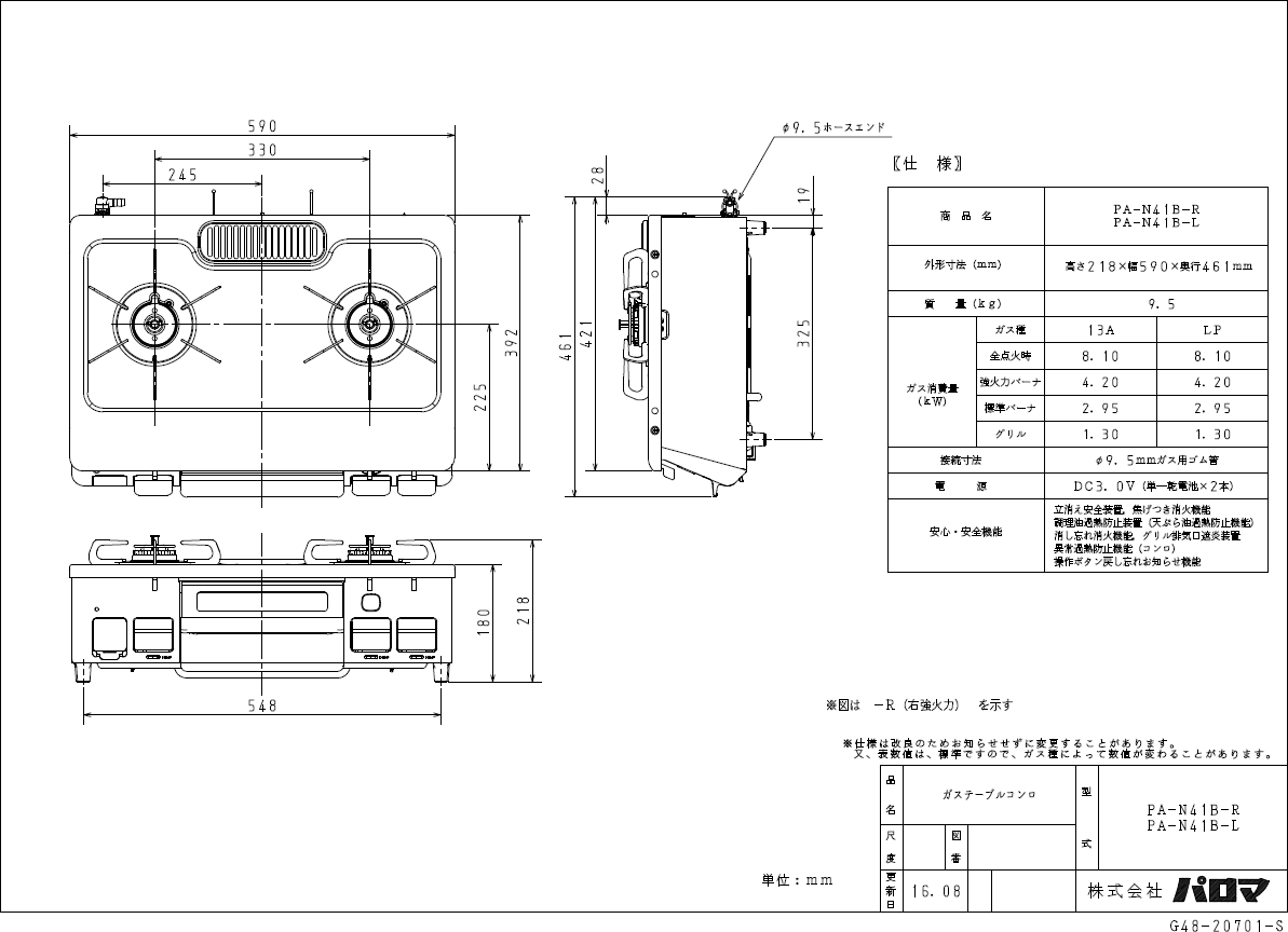 特許番号 第4203521号、第4071884号、第3953204号、第4883588号 早切れ防止機能(異常過熱防止機能) コーティング焼き網(メッキ) 点火確認(コンロ/グリル)・・・カラーサイン コンロ・グリル消し忘れ消火機能(コンロ120分/グリル22分) 調理油過熱防止装置(全口)/立消え安全装置/焦げつき消火機能 チャイルドロック 中火点火(強火力側) グリル扉上部防熱カバー 仕様 メーカー パロマ 型番 PA-N41B-R/L トッププレート/カラー ホーロートップ/チャコール 外形寸法 [mm] 高さ180×幅590×奥行462(421) グリル庫内寸法 [mm] 幅209×奥行317×上段61/下段76 質量 [kg] 9.5 ガス接続/電源 9.5mmΦガス用ゴム管/アルカリ乾電池:単1×2個 ガス消費量 [13A:Kw(kcal/h)] [LPガス:Kw(kg/h)] [13A]強火力4.20(3610)、標準2.95(2536)、グリル1.30(1118)、全点火時8.10(6966) [LPガス]強火力4.20(0.301)、標準2.95(0.211)、グリル1.30(0.139)、全点火時8.10(0.579) この商品について 接続には、ガスホースが必要です。